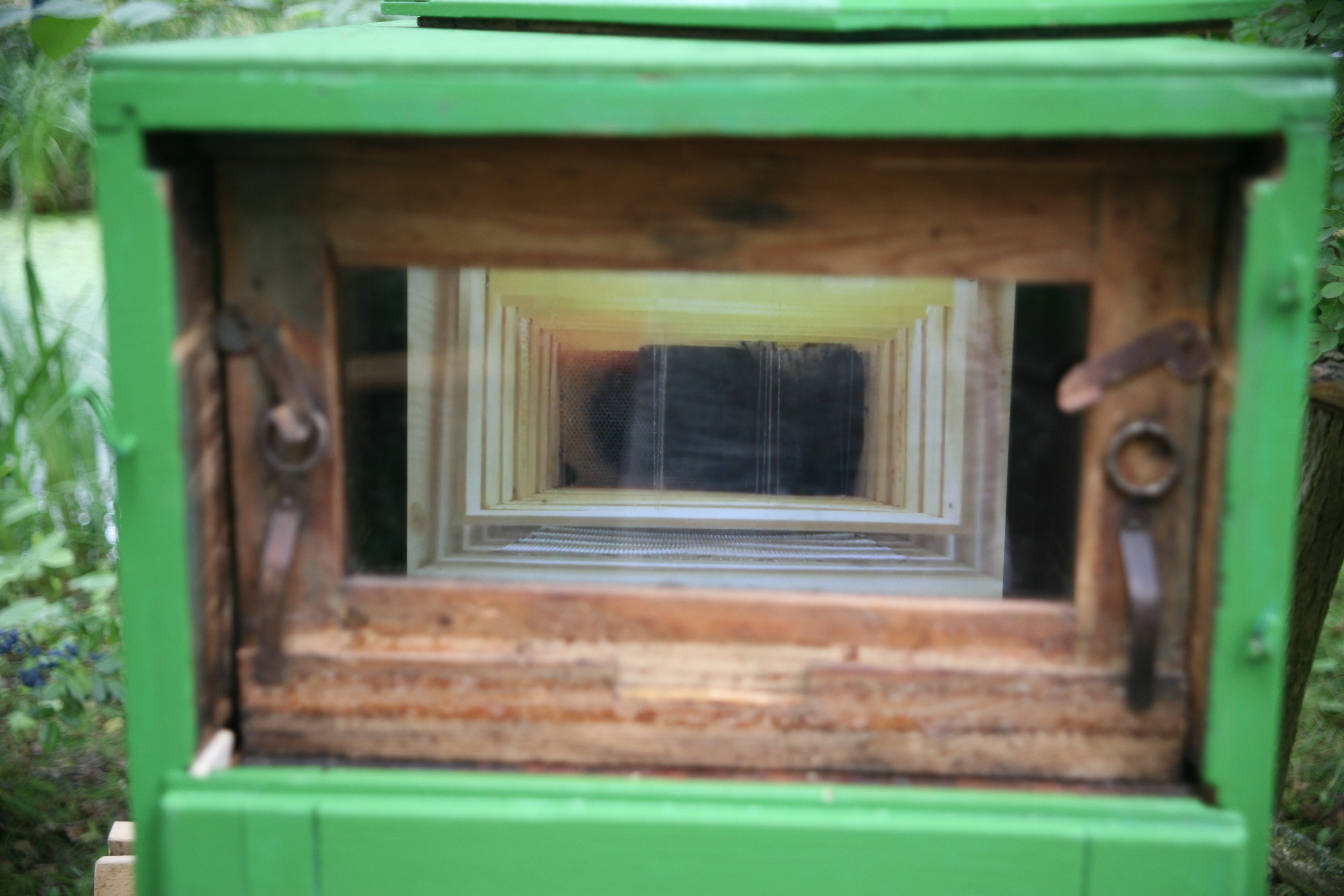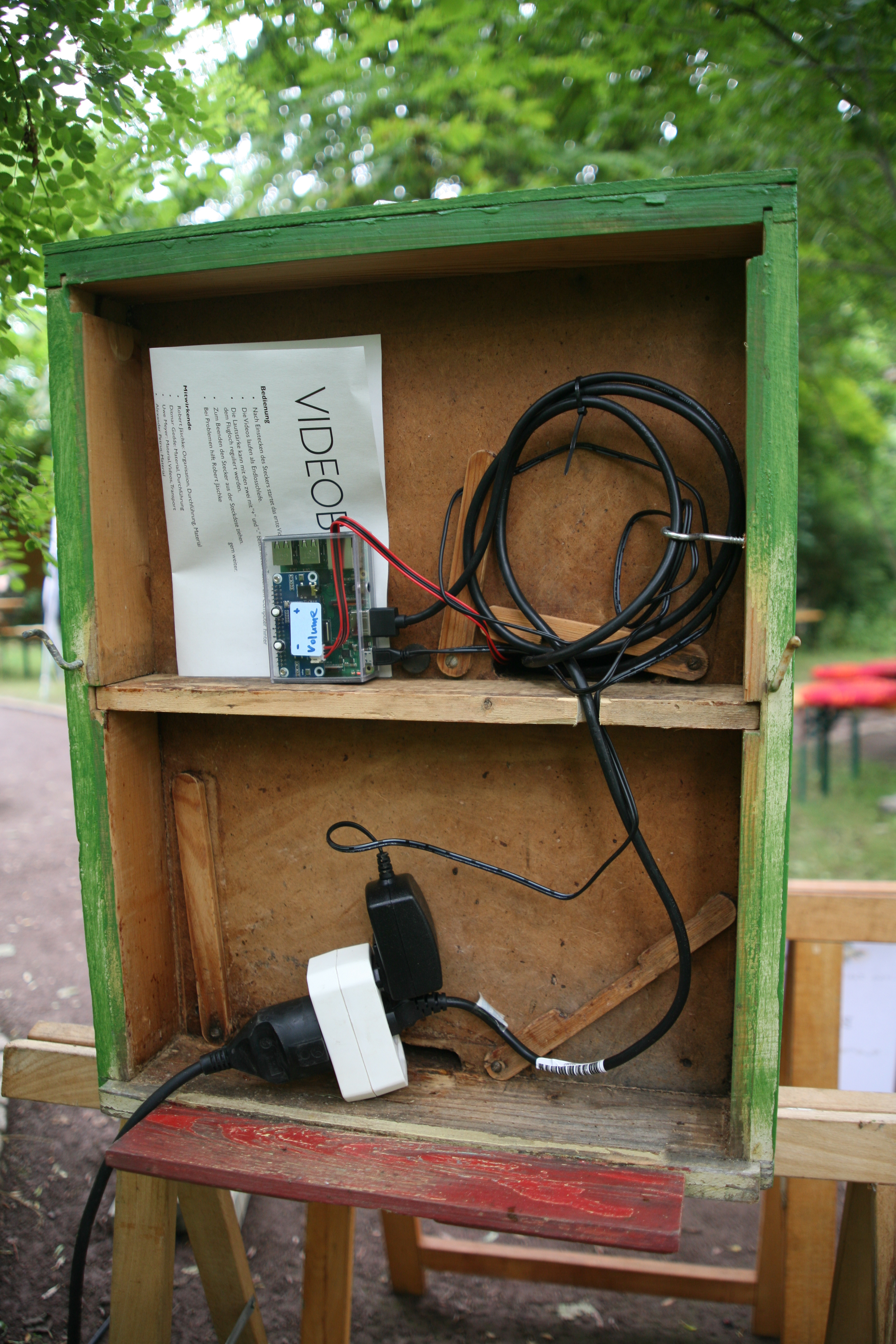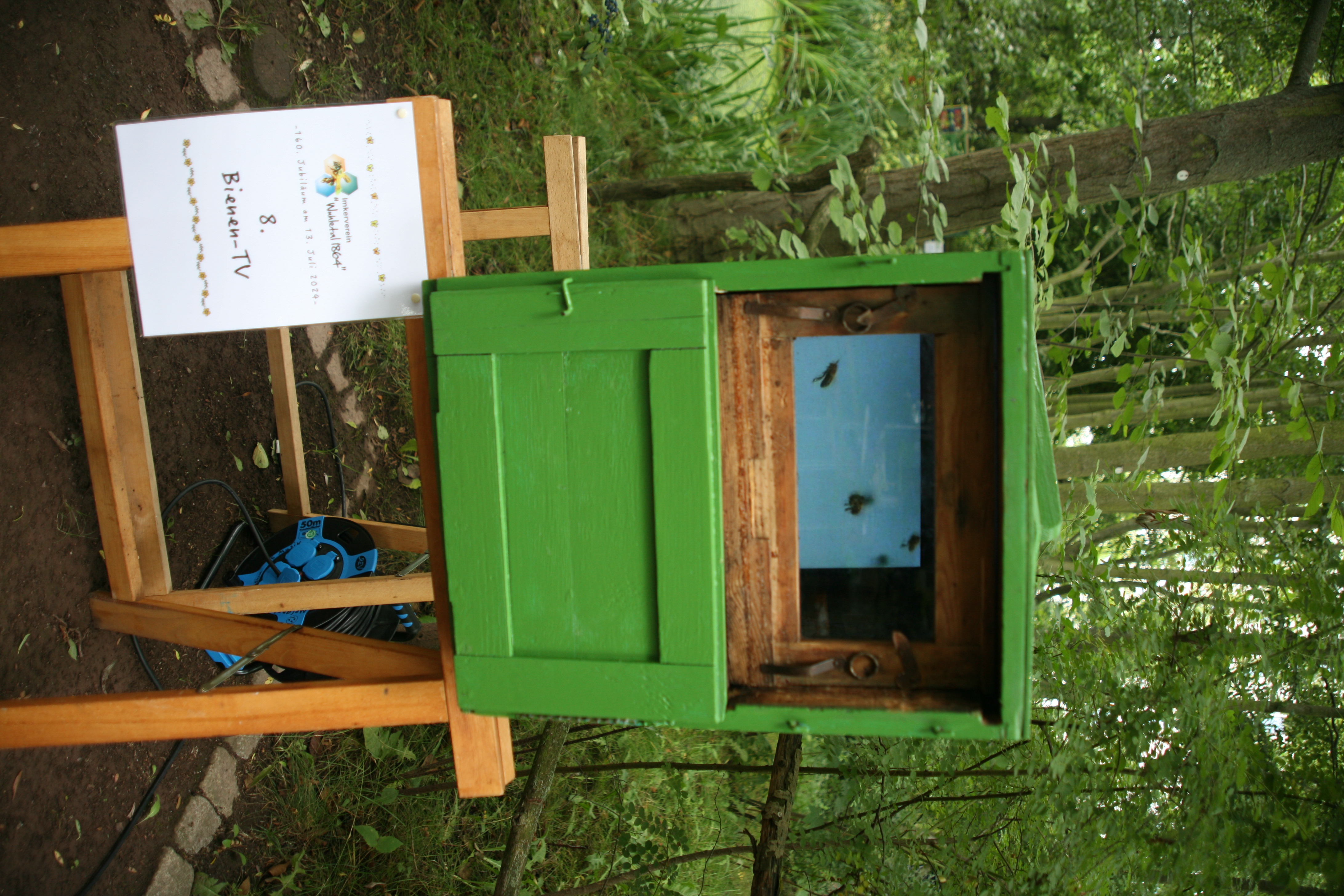 Zur 160-Jahrfeier unseres Imkervereins Wuhletal 1864 e.V. wollten wir den Besuchern gerne Lehrfilme zeigen. Aufgrund der sonnigen Lichtverhältnisse suchten wir nach Alternativen zu Projektion und Leinwand und kamen auf die Idee, einen Bildschirm in eine ausgediente Beute einzubauen. Somit war die “Videobeute” als Ausstellungs- und Schulungsobjekt für unseren Bienenlehrgarten geboren.